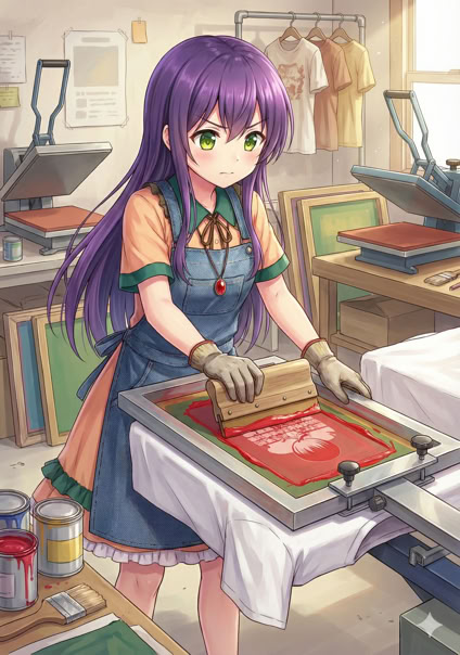生地の上にインクをのせるイメージ。どっしりとした色合いに仕上がる。発色はいいが、インクの定着に熱を加える必要がある。洗濯してもほぼ色合いは風化しない。熱でしかインクが硬化しないので、版の目詰まりが少ない。片付けには溶剤を利用するので苦手な人にはオススメできない。